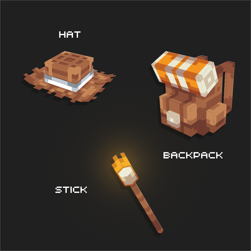 This is a camping-themed add-on pack for Minecraft, featuring a practical hat to protect from the sun, a backpack ready to carry all the essentials for a trip, and a stick with roasted marshmallows symbolizing the campfire atmosphere. The entire set is designed in a light and pleasant style, perfect for creating campsites, forest adventures, and carefree moments spent outdoors.